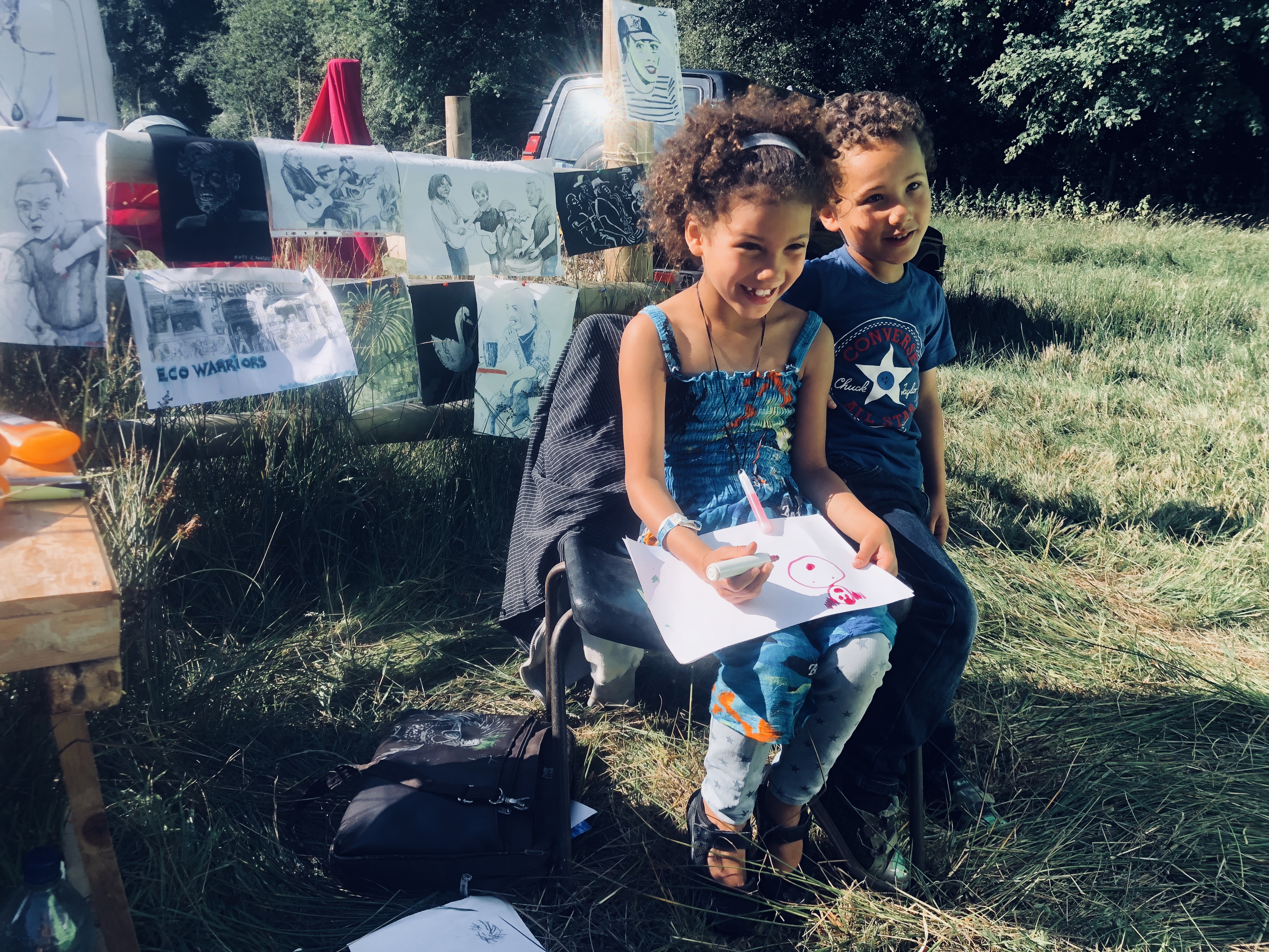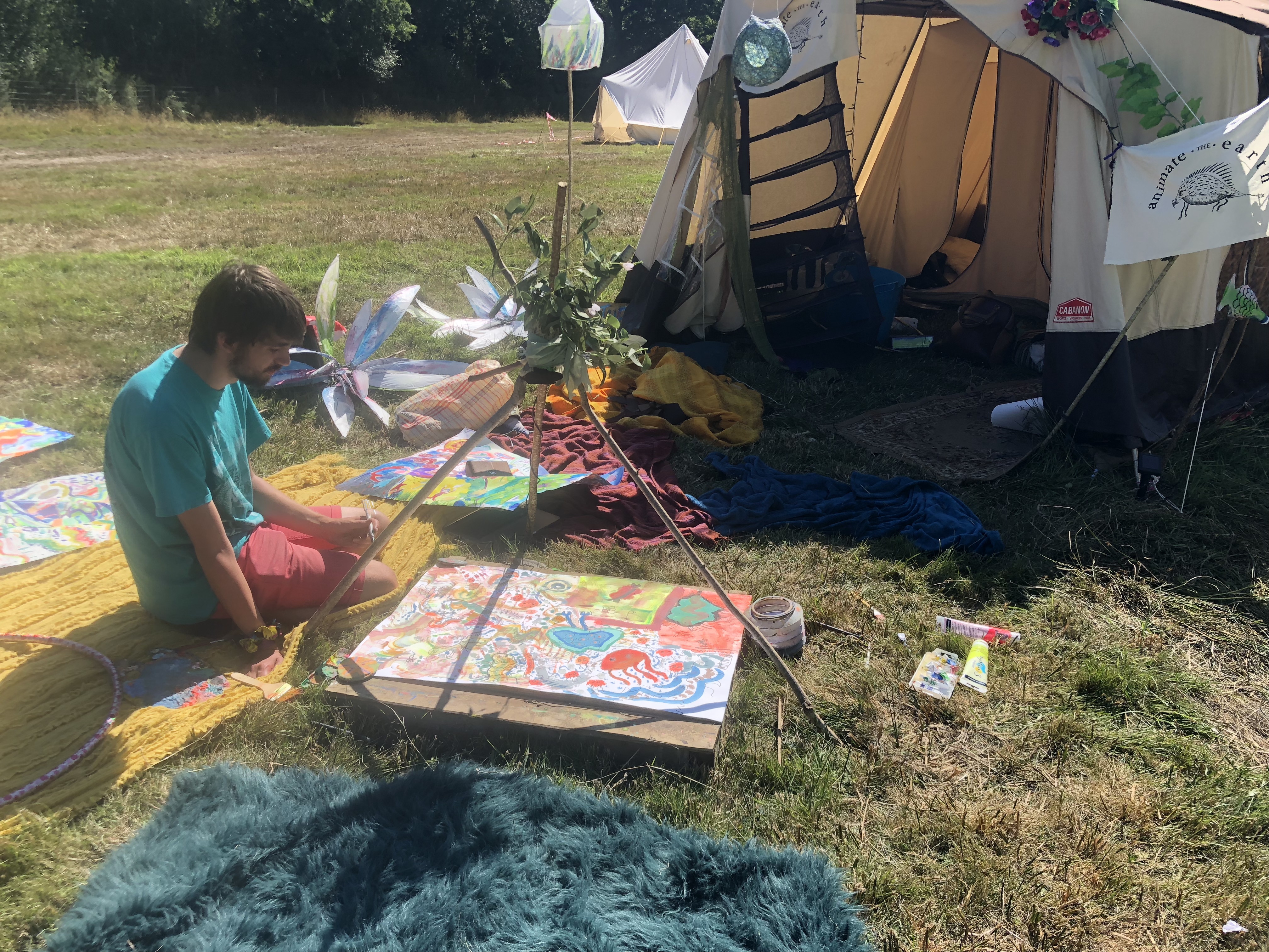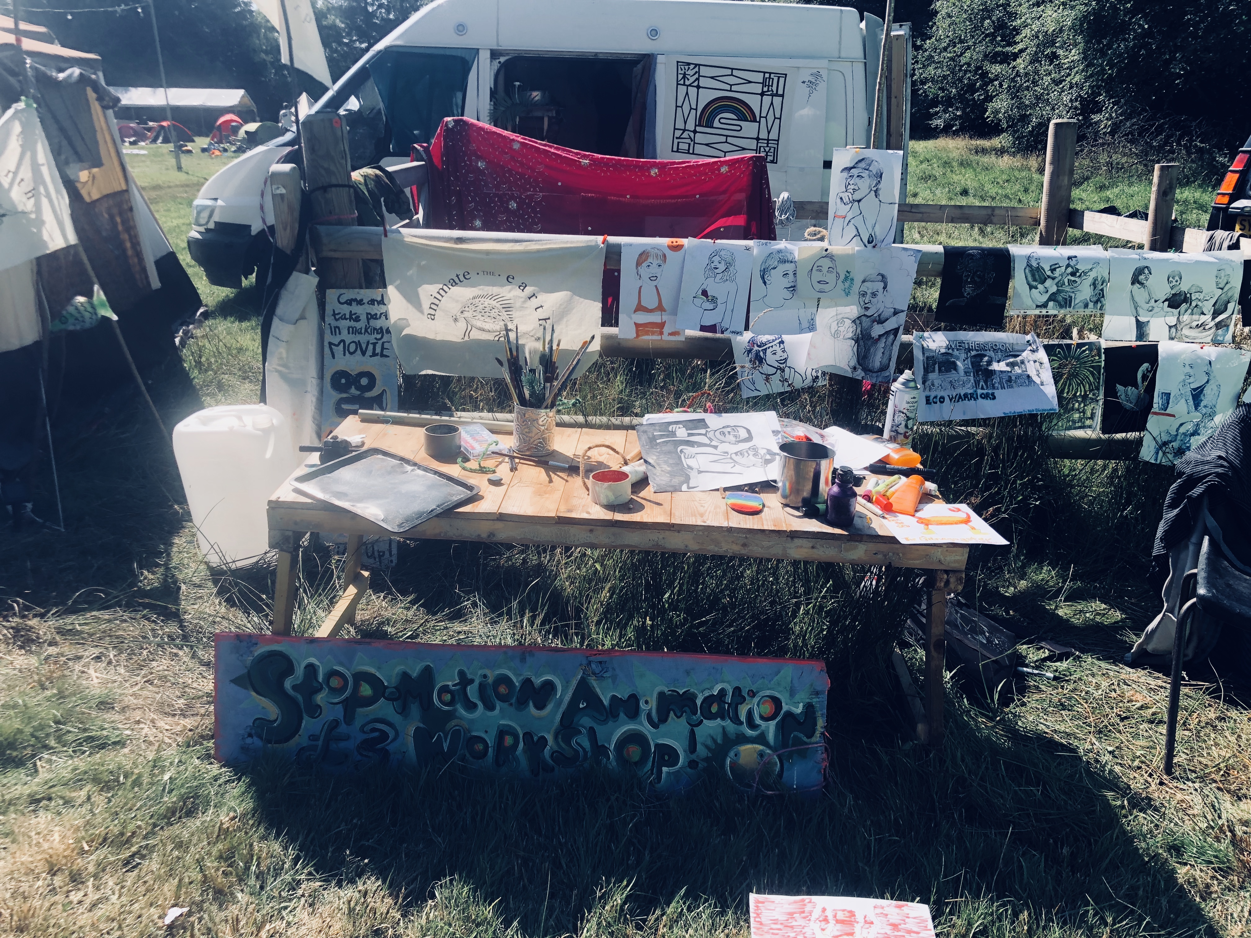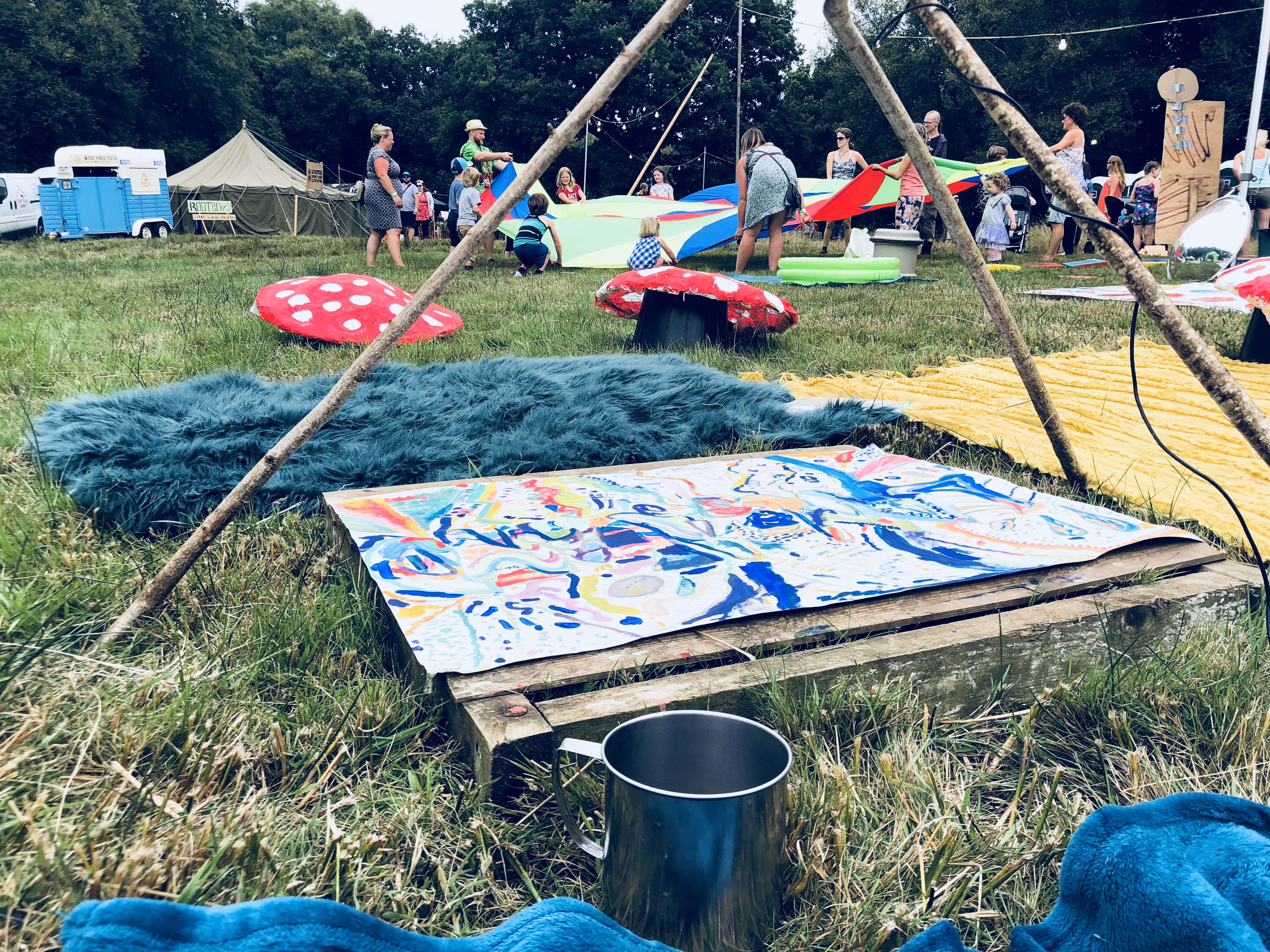 We started by setting up the pitch, with our portrait artist Mark next to us we found a quite nice fence to display some art. Hannah Denholmโs beautifully crafted wood and painted paper-mache shrooms dotted all around the workshop.