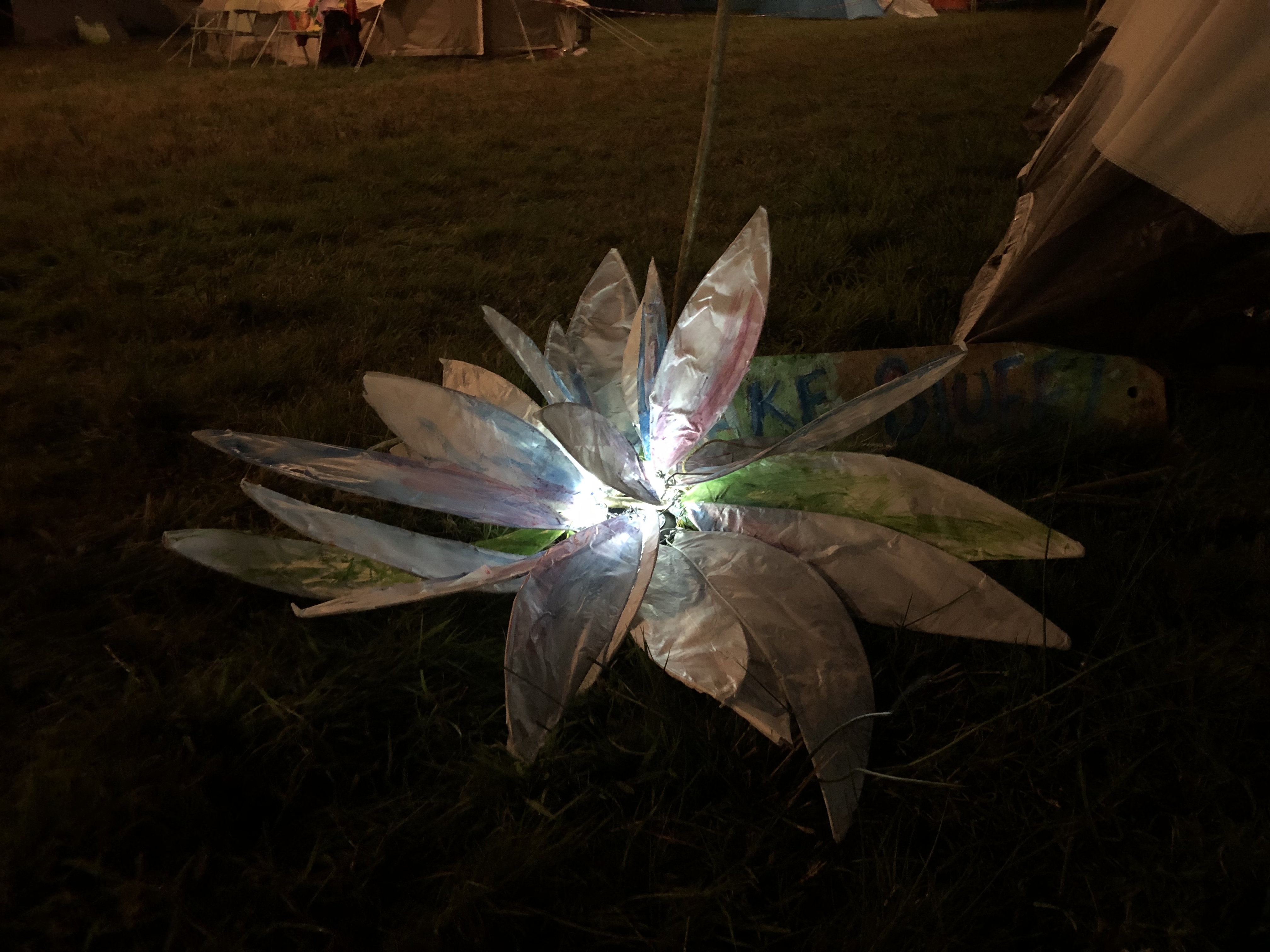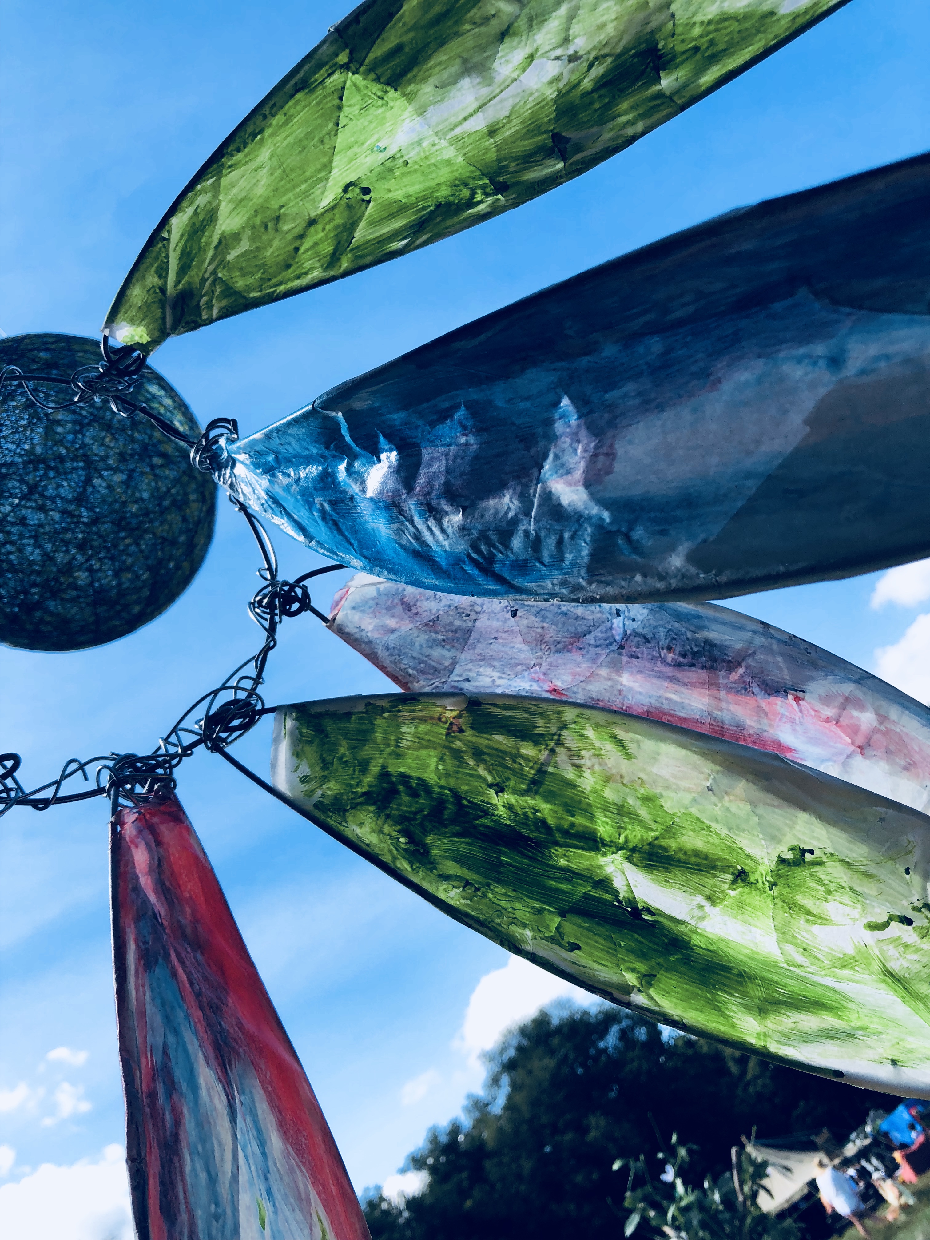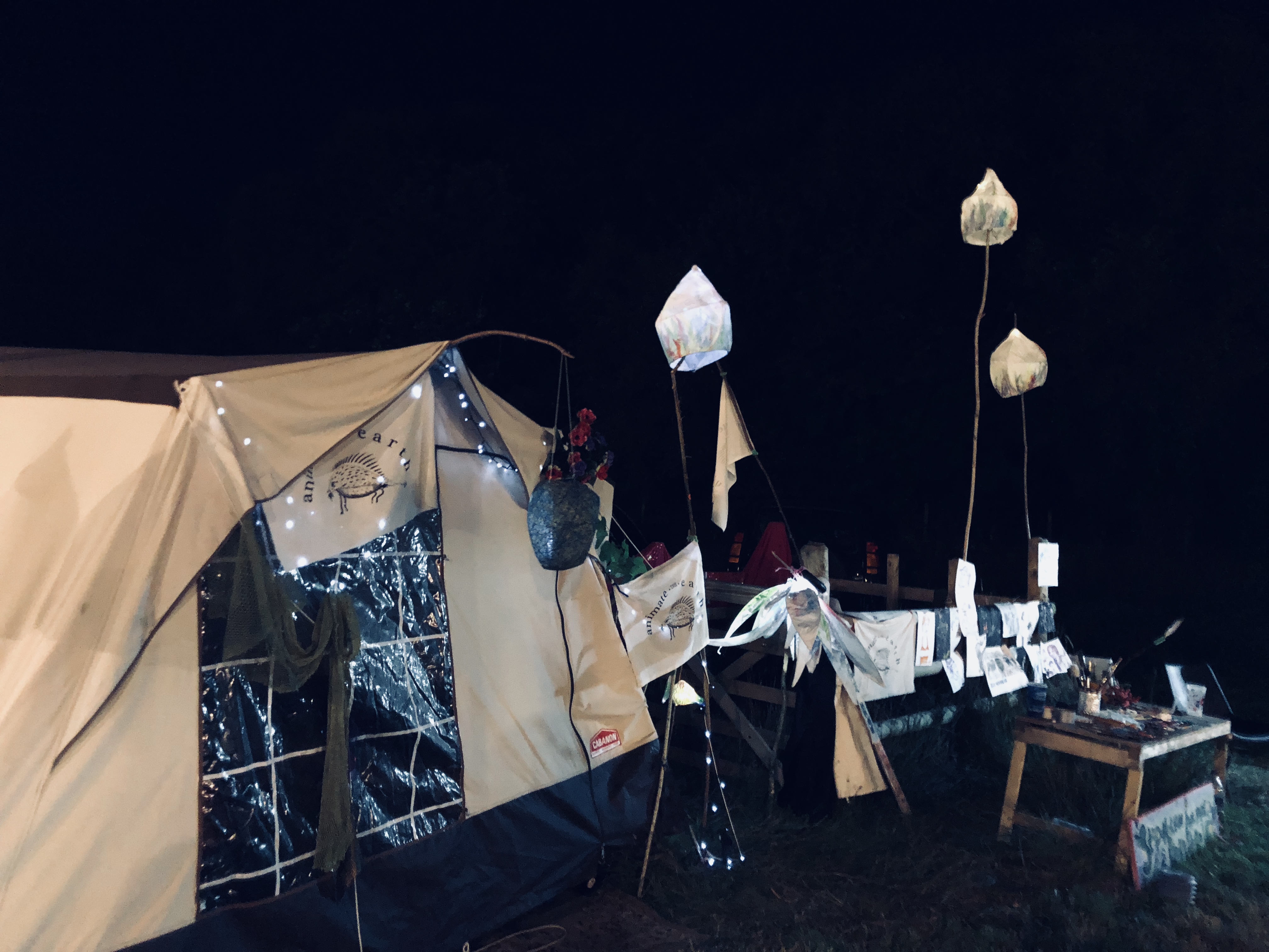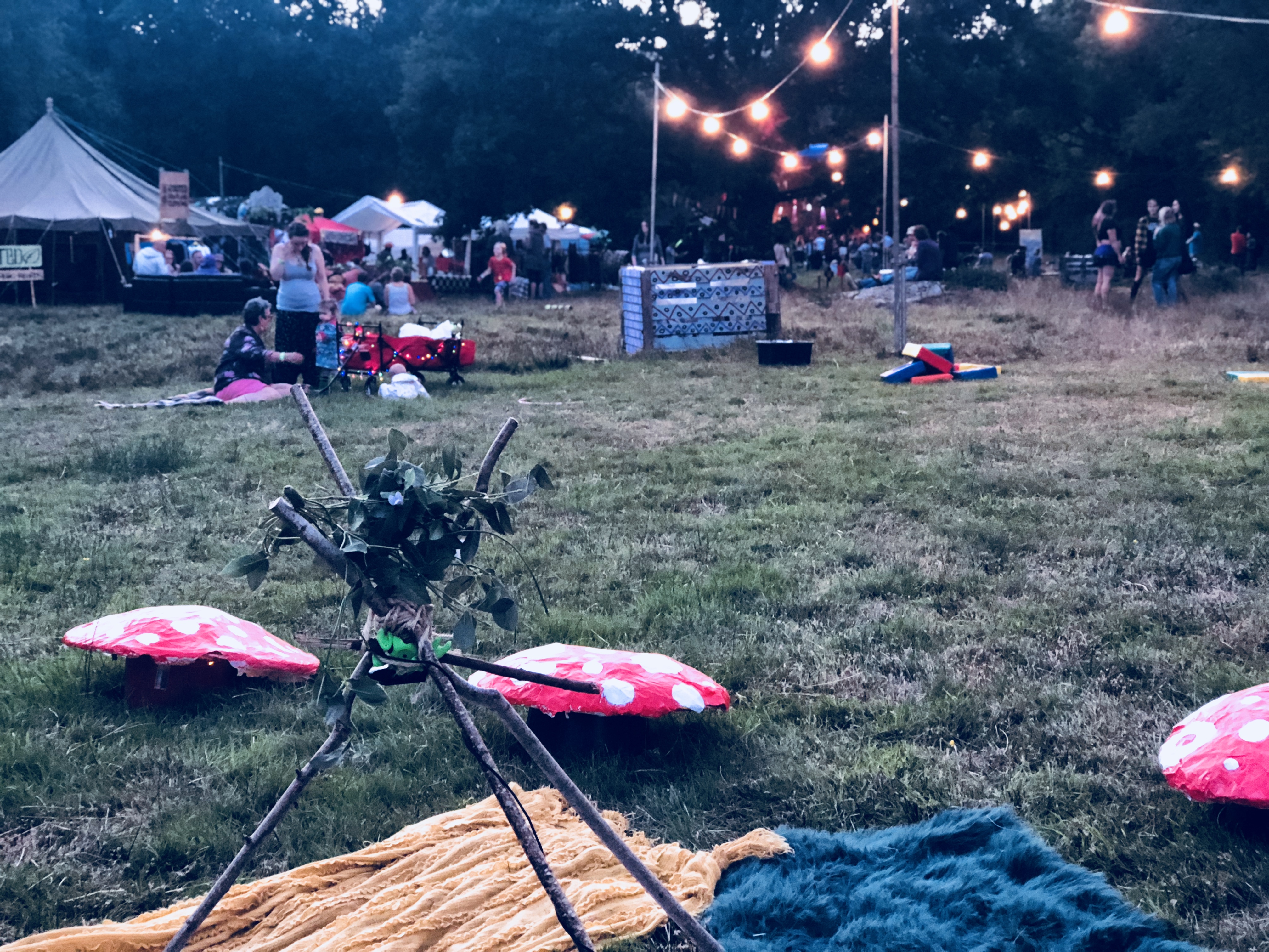 We started by setting up the pitch, with our portrait artist Mark next to us we found a quite nice fence to display some art. Hannah Denholmโs beautifully crafted wood and painted paper-mache shrooms dotted all around the workshop.