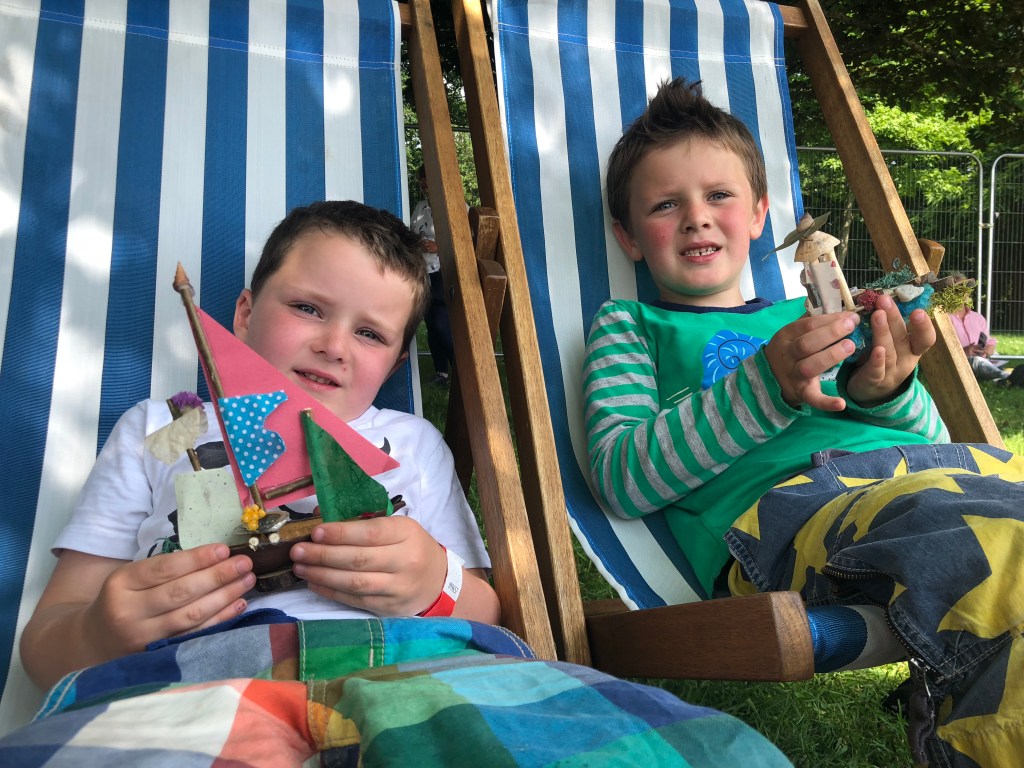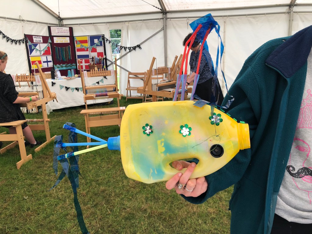 I volunteered on the workshop ran by Stover School, we were making fish from recycled bottles. This was very fun, we attached pieces of plastic as fins and tails.